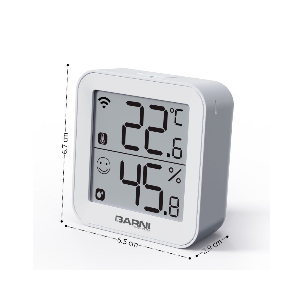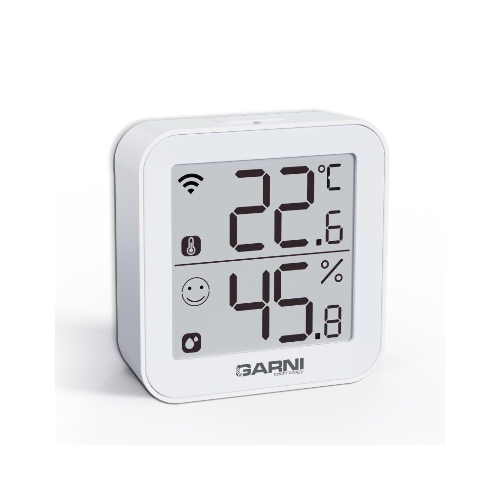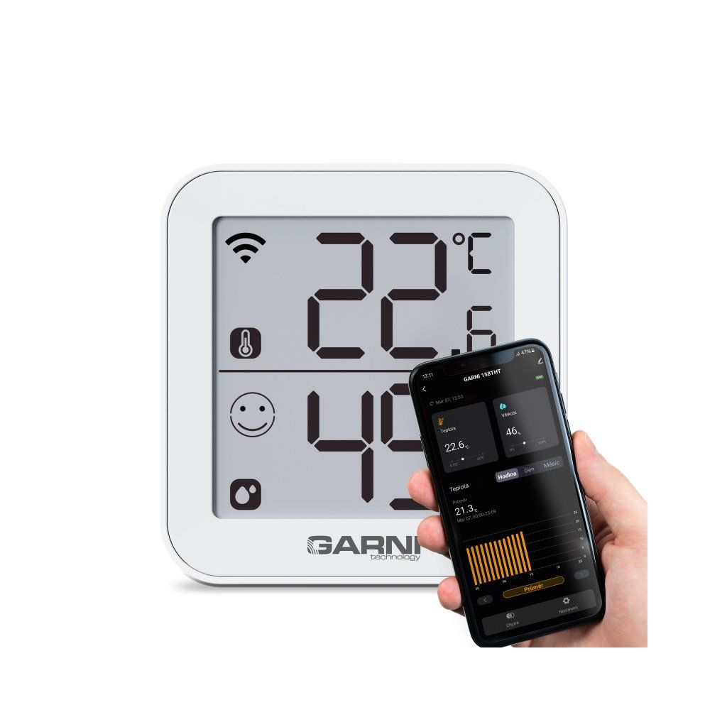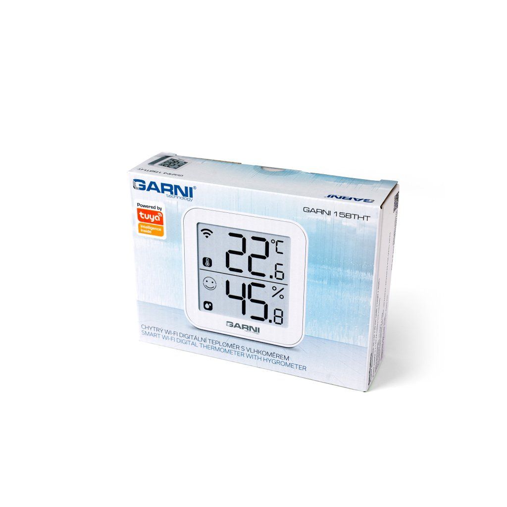 Chytrý vnitřní digitální teploměr s vlhkoměrem model GARNI 158THT má vestavěný modul Wi-Fi a prostřednictvím svého chytrého systému je kompatibilní s platformou Tuya IOT. Pomocí aplikace Tuya Smart můžete sledovat vnitřní teplotu a relativní vlhkost, prohlížet historii záznamů, nastavovat alarmy pro dané veličiny, spouštět pokročilé funkce za pomocí naměřených hodnot a naměřená data odeslat na email v Excel souboru. Je možné jej propojit s dalšími produkty chytré domácnosti, ovládání pak probíhá přes aplikaci v mobilním zařízení. Podporuje integraci do Google Assistant a Alexa.