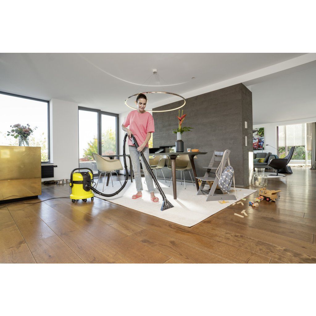Tepovač SE 4001 Limited Edition přispívá k čistotě do hloubky vláken na textilních plochách, jako jsou koberce, čalounění, schodiště s textilními podlahovými krytinami, matrace, tapisérie a autosedačky. Čerstvá voda z vodovodu a čistič koberců Kärcher RM 519 se tlakem nastříkají hluboko do textilních oblastí a společně s uvolněnými nečistotami se znovu vysají. Sprejový extrakční stroj je perfektní např. pro každého, kdo trpí alergií a domácnosti s domácími mazlíčky. Díky inovativní technologii trysek jsou čištěné plochy opět suché o 50 % rychleji. Velká odnímatelná nádrž na čerstvou vodu o objemu 4 l je odolná proti nárazu, je průhledná a usnadňuje plnění a vyprazdňování. Nasávaná špinavá voda se shromažďuje v nádobě. Rukojeť 3 v 1 umožňuje pohodlné přenášení, otevírání, zavírání a vyprazdňování nádoby. Robustní plastová nádoba nabízí možnost přehledného uložení kabelu a příslušenství. Díky rozsáhlému příslušenství lze přístroj využít i jako plnohodnotný víceúčelový vysavač.