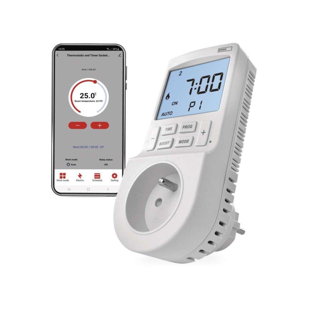 barva: bílá|další funkce: časovač; měřič spotřeby el.energie|dětské clonky: ano|druh: digitální|druh regulace: vytápěcí a chladící systém|energetická třída: –|funkce odpočítávání countdown: ne|funkce ON/OFF: ano|funkce změny letní/zimní čas: ano|jazyky aplikace: EN, CZ, SK, PL, DE, HU, SI, FR, + 60 dalších jazyků|kalibrace teploty: ano|kompatibilita: EMOS GoSmart, TUYA, LIDL, Smartlife, Otevřený systém|krytí: IP30|max. zátěž: 3 680 W|měření teploty: 0 °C až 45 °C, rozlišení 0,1 °C|minimální doba sepnutí: 1 minuta|možnost ručního zapnutí: ano|napětí/proud: 230 V~/16 A max.|nastavení teploty: 5 °C až 40 °C, rozlišení 0,5 °C|nastavitelný rozptyl teploty: 0,2 °C až 2 °C, po 0,1 °C|notifikace do mobilní aplikace: ano|ochrana proti zamrznutí: ne|ovládání hlasovými asistenty: ano (Amazon Alexa, Google Assistant)|počet programů pro časovač: 24|počet programů pro termostat: uživatelsky nastavitelná teplota (6× za den)|počet spínání za den pro časovač: 24|podporované OS: Android, iOS|podsvícený displej: ano|prodejní obal: 1 ks, krabička|protokol: Wi-Fi|řada: GoSmart|rozměr: 82 × 62 × 146 mm|součást balení: –|spíná: fázový vodič|spínaná zátěž: 16 A odporově, 4 A induktivně|spínání: 230 V AC nebo beznapěťové|typ nastavení teploty: 6 teplotních změn denně|typ ovládání: programovatelný elektronický pokojový termostat, možnost ovládaní přes mobil (iOS, Android)|typ termostatu: zásuvkový|venkovní použití: ne|záložní akumulátor: ne|záruční doba: 2 rokyDoplňkové parametry