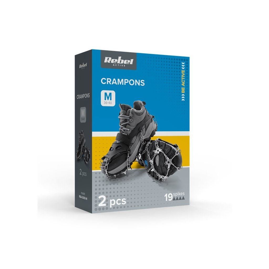 Protiskluzové návleky na obuv REBEL ACTIVE RBA-5000-M jsou určeny pro bezpečný pohyb na kluzkém povrchu během zimních aktivit. Díky ocelovým hrotům a řetězům z nerezové oceli zvyšují stabilitu na ledu i ušlapaném sněhu a pomáhají snížit riziko uklouznutí při chůzi i lehčí turistice.