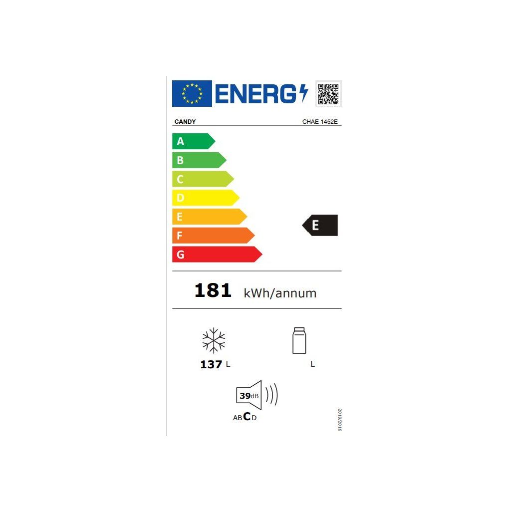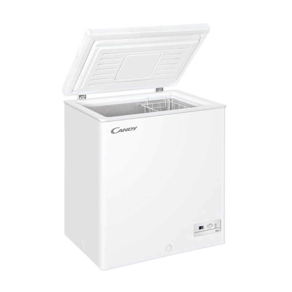 Truhlicový mrazák Candy CHAE 1452E v bílém provedení má objem 137 litrů. Je vybaven statickým chlazením, elektronickým ovládáním, digitálním displejem a funkcí rychlého mrazení. Zmrazí až 8,5 kg potravin za 24 hodin. V případě výpadku proudu je doba skladování až 21 hodin. Hlučnost: 39 dB. Uvnitř má 1 drátěný koš.