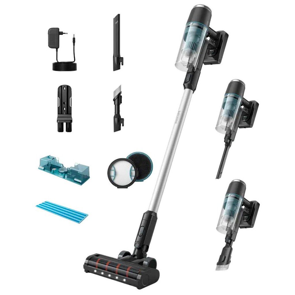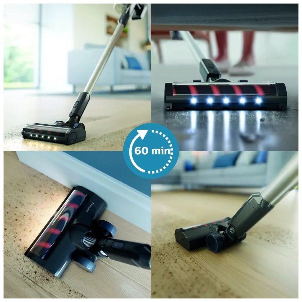 Vysavač je vybaven LED hubicí, která odhaluje i nejjemnější prach a nečistoty, a díky třístupňové filtraci zachycuje 99,7 % prachových částic. S výdrží až 60 minut v režimu Eco je ideální pro úklid větších prostor. Ergonomická konstrukce a praktický nástěnný držák s automatickým nabíjením zajišťují pohodlné používání a úložný prostor.