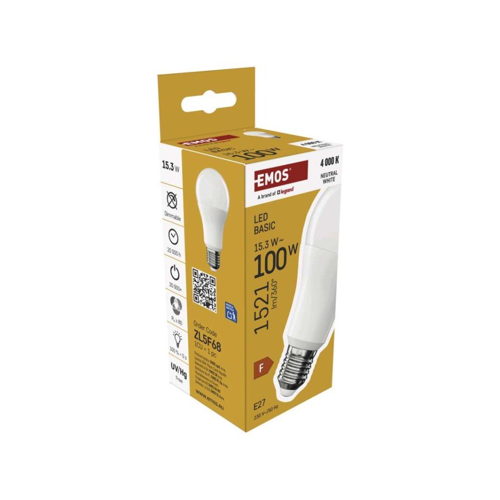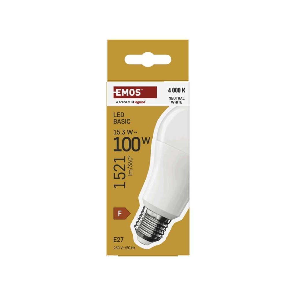 barva světla: neutrální bílá|energetická třída: F|index podání barev (CRI): 80|kompatibilita: –|náhrada za žárovku: 100 W|napětí: 230 V~/50 Hz|notifikace do mobilní aplikace: ne|ovládání hlasovými asistenty: ne|patice (uchycení žárovky): E27|počet čipů: neuvádí se|počet spínacích cyklů: 20 000|podporované OS: –|přenosová frekvence: –|příkon: 15,3 W|prodejní obal: 1 ks, krabička|protokol: –|řada: BASIC|rozměr: 60 × 60 × 125 (max.) mm|stmívatelná: ne|světelná účinnost: 99 lm/W|světelný tok: 1 521 lm|technologie: LED|teplota chromatičnosti: 4 000 K|tvar: A60|typ čipů: SMD|účiník: 0,50|úhel vyzařování: 200°|záruční doba: 2 roky|životnost: 20 000 hodinDoplňkové parametry