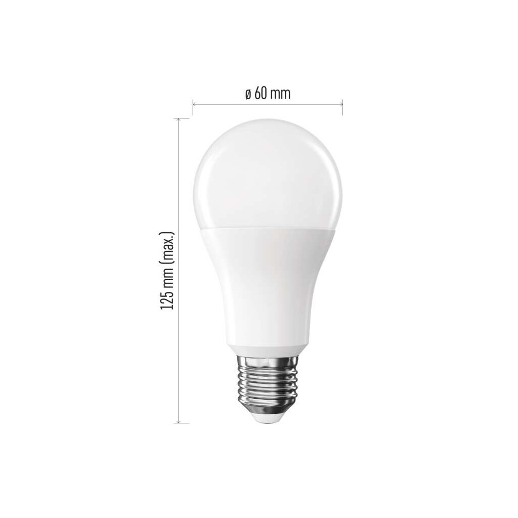 barva světla: teplá bílá|energetická třída: F|index podání barev (CRI): 80|kompatibilita: –|náhrada za žárovku: 100 W|napětí: 230 V~/50 Hz|notifikace do mobilní aplikace: ne|ovládání hlasovými asistenty: ne|patice (uchycení žárovky): E27|počet čipů: neuvádí se|počet spínacích cyklů: 20 000|podporované OS: –|přenosová frekvence: –|příkon: 15,3 W|prodejní obal: 1 ks, krabička|protokol: –|řada: BASIC|rozměr: 60 × 60 × 125 (max.) mm|stmívatelná: ne|světelná účinnost: 99 lm/W|světelný tok: 1 521 lm|technologie: LED|teplota chromatičnosti: 3 000 K|tvar: A60|typ čipů: SMD|účiník: 0,50|úhel vyzařování: 200°|záruční doba: 2 roky|životnost: 20 000 hodinDoplňkové parametry