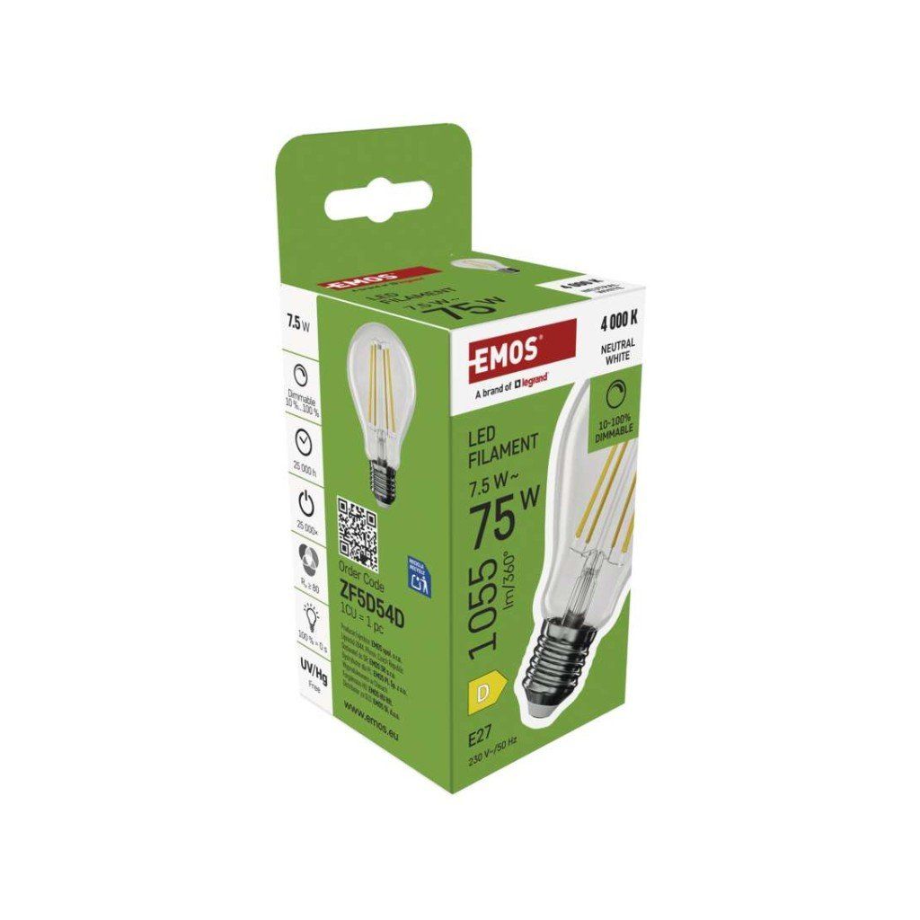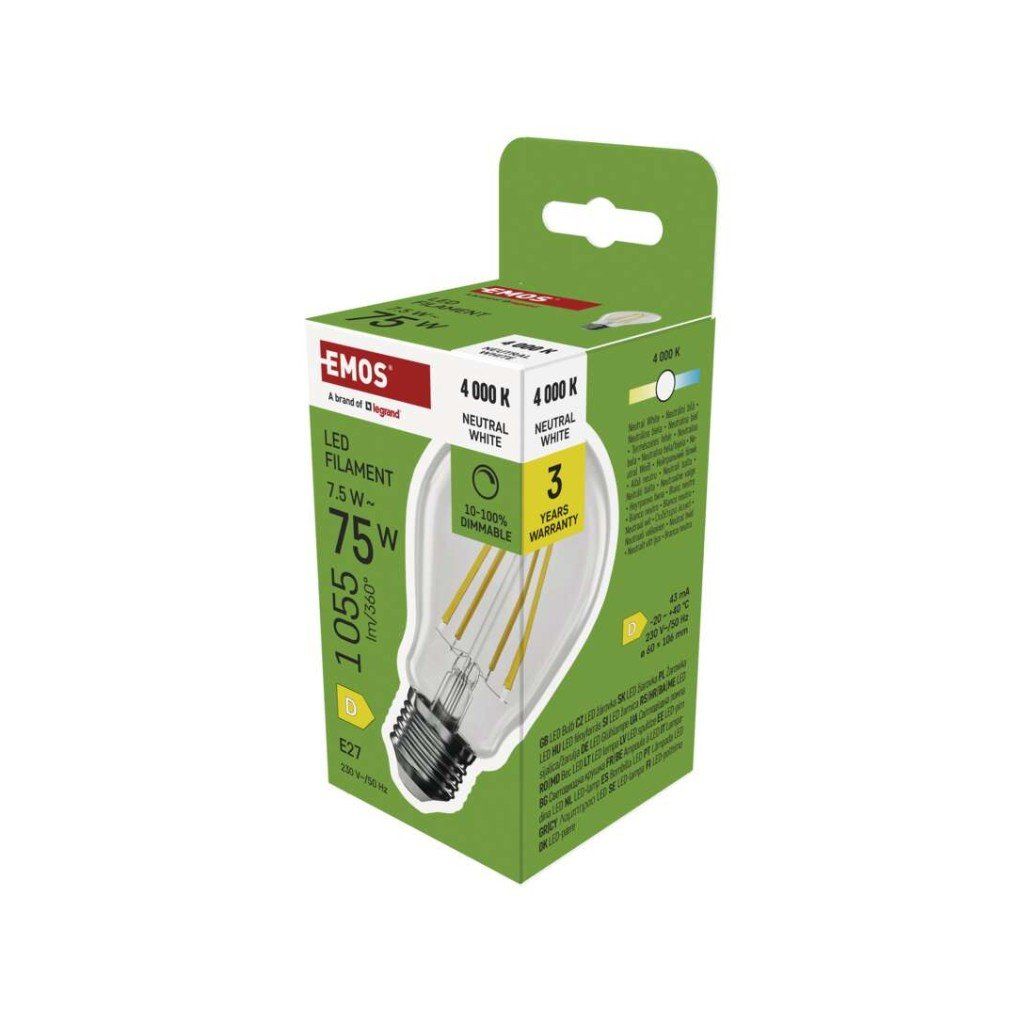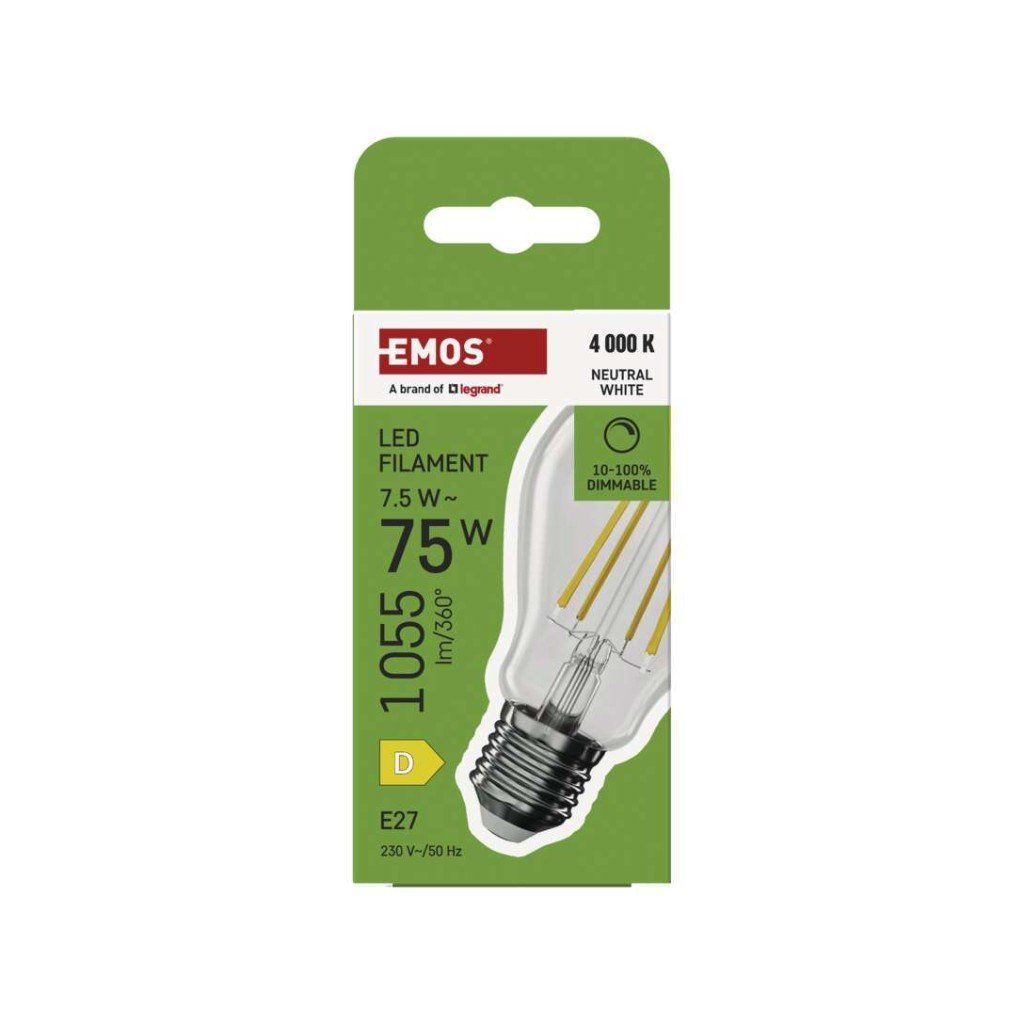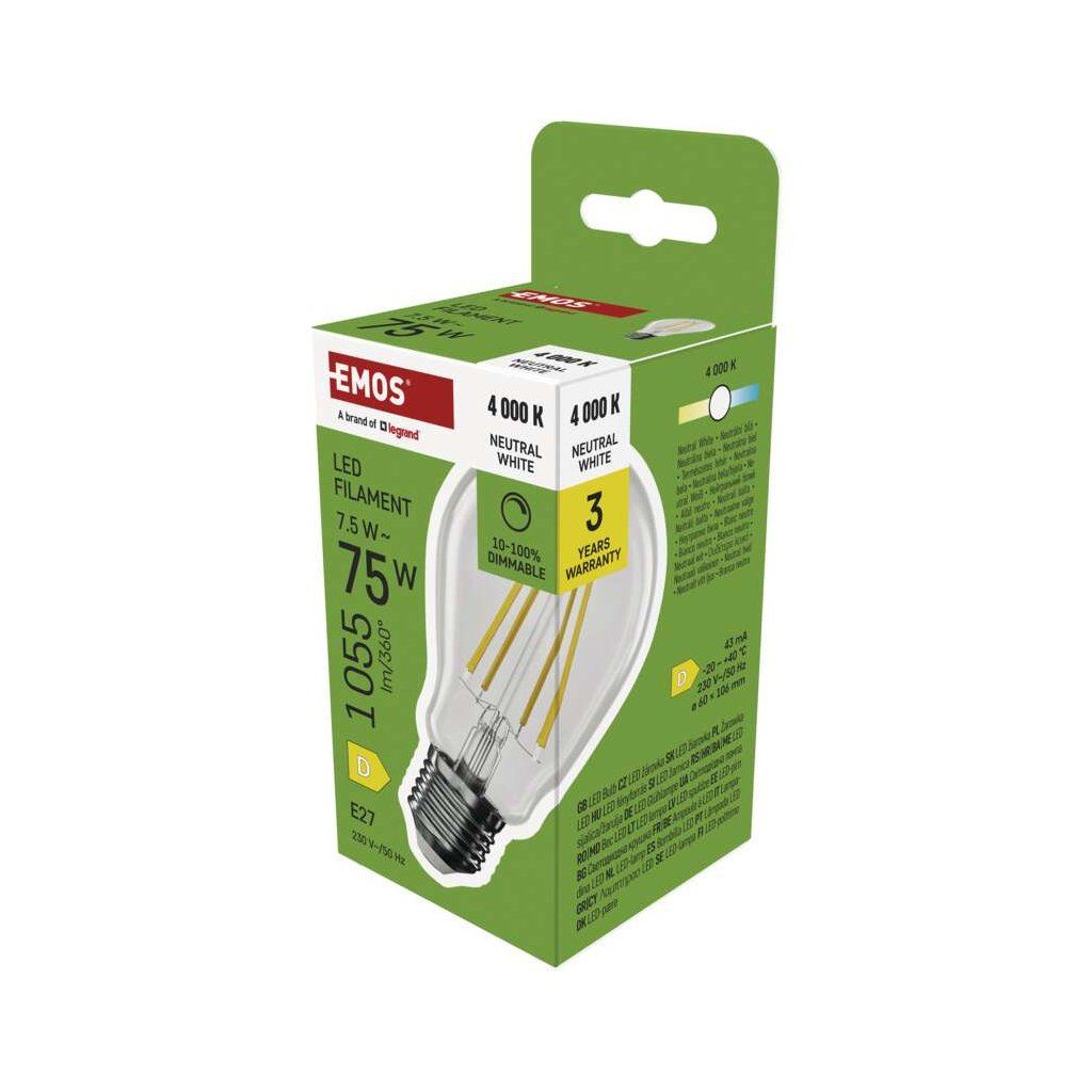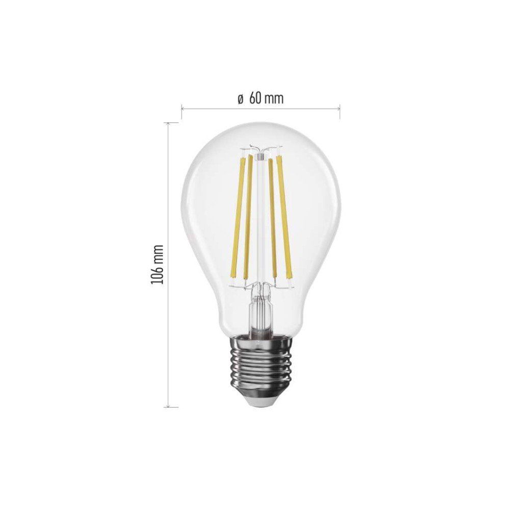 barva světla: neutrální bílá|energetická třída: D|index podání barev (CRI): 80|kompatibilita: neuvádí se|náhrada za žárovku: 75 W|napětí: 230 V~/50 Hz|notifikace do mobilní aplikace: neuvádí se|ovládání hlasovými asistenty: neuvádí se|patice (uchycení žárovky): E27|počet čipů: neuvádí se|počet spínacích cyklů: 25 000|podporované OS: neuvádí se|přenosová frekvence: neuvádí se|příkon: 7,5 W|prodejní obal: 1 ks, krabička|protokol: neuvádí se|řada: FILAMENT|rozměr: 60 × 60 × 106 mm|stmívatelná: ano|světelná účinnost: 141 lm/W|světelný tok: 1 055 lm|technologie: LED|teplota chromatičnosti: 4 000 K|tvar: A60|typ čipů: COB|účiník: 0,73|úhel vyzařování: 320°|záruční doba: 3 roky|životnost: 25 000 hodinDoplňkové parametry
