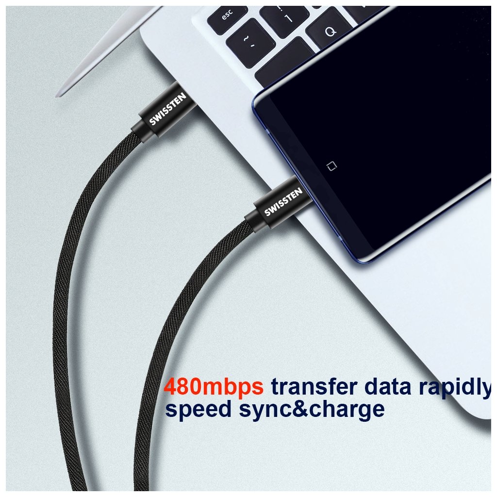 Datový kabel Swissten USB-C/USB-C s kvalitním textilním opletením a kovovými kryty konektorů. Díky délce 2,0m je vhodný do nákladních aut, do aut pro rodiny, nebo v případě že chcete nabíjet a zároveň smartphon používat. Kabel je zesílený a přenese tak větší proud (až 3A) a zvládne i rychlý přenos dat 480 Mb/s. Životnost kabelu v ohybu je více než 10000 ohybů. Kovový kryt konektoru je odolnější proti mechanickému poškození než běžné plastové kryty konektorů. Baleno v blistru SWISSTEN. Technické parametry: Tloušťka kabelu- dva pocínované měděné vodiče, kde každý 22 AWG 70/0,01 (to znamená, že každý vodič má 70 pramenů tenkých 0,01 mm, (např originální kabel Apple MD818 má 37 pramenů o tloušťce 0,08 mm) + vnější plášť TPE (měkký plast)