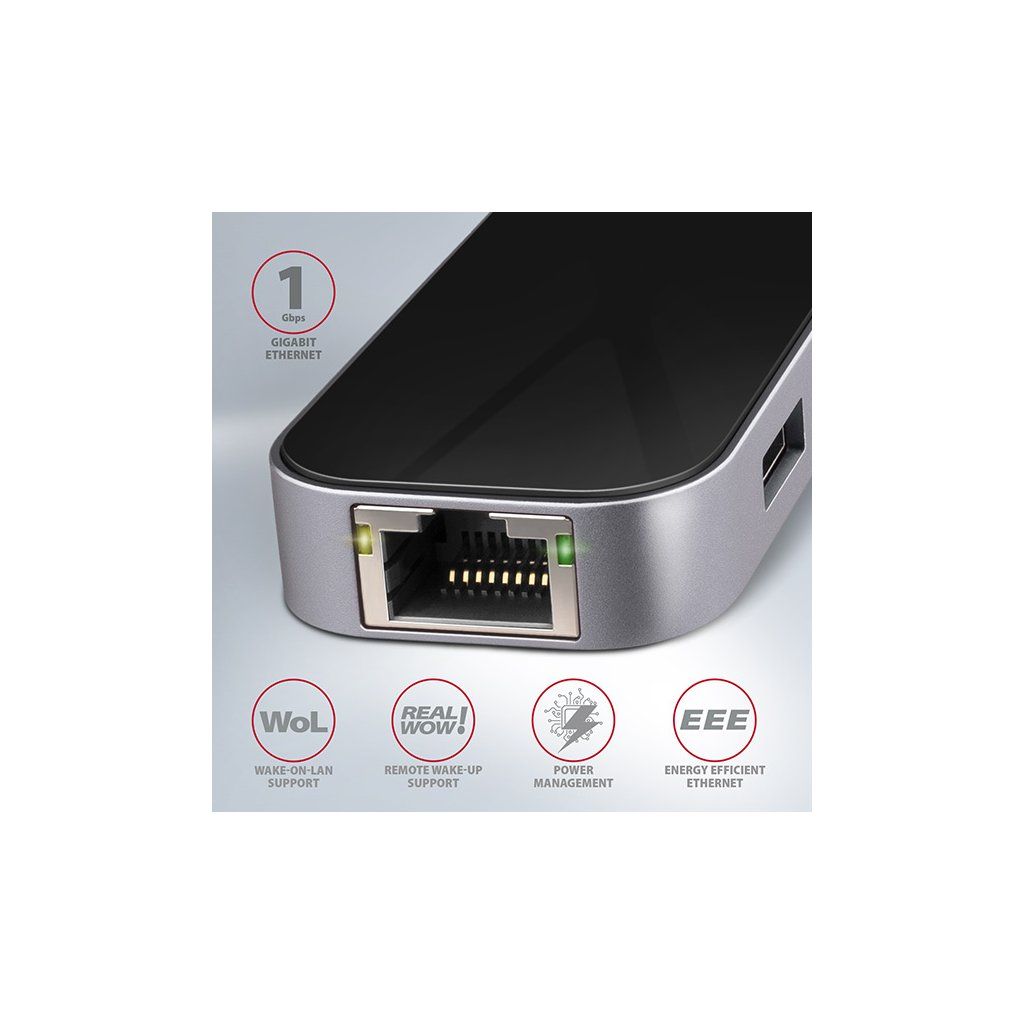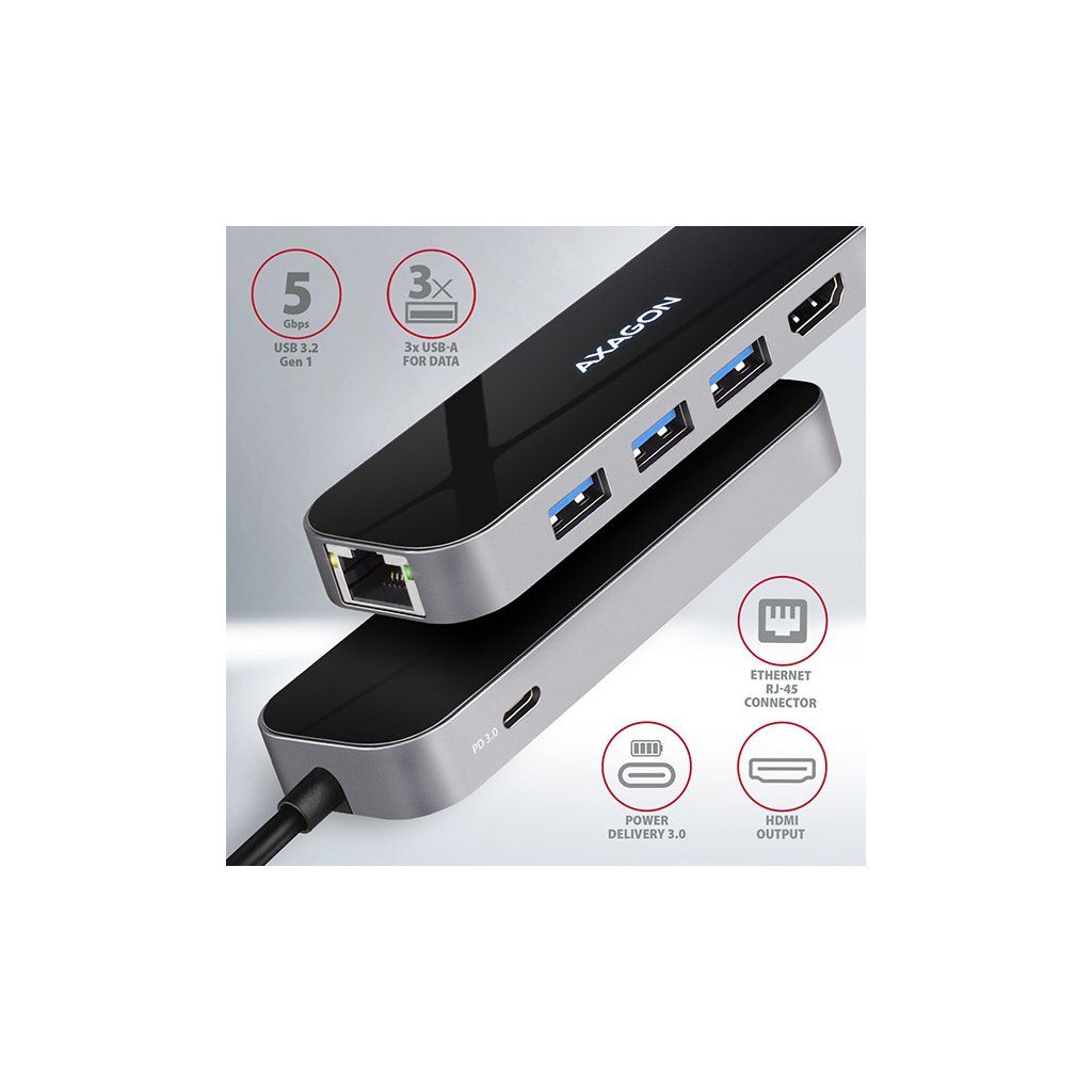 Multiportový USB-C 3.2 Gen 1 hub AXAGON HMC-6GL rozšíří Váš notebook, počítač nebo telefon o šest portů. Přes oboustranný USB-C konektor snadno a rychle připojíte k počítači až tři USB zařízení, Gigabitovou ethernet síť a HDMI zobrazovač současně. Zároveň získáte možnost napájení notebooku pomocí technologie Power Delivery. USB-C hub vám tak poskytne jednoduchou a skladnou dokovací stanici 6v1 k notebooku jako je například MacBook Pro.