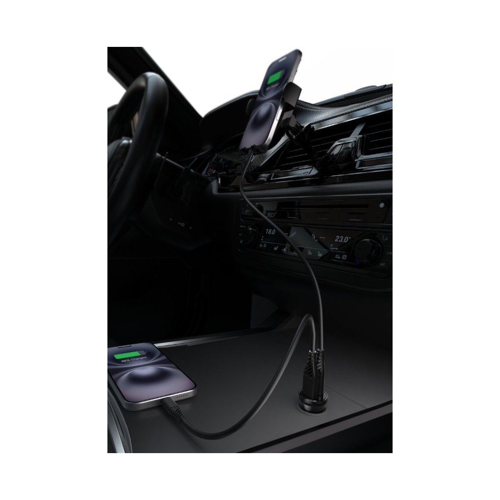Autonabíječka automaticky detekuje připojené zařízení a přizpůsobí mu optimální nabíjecí výkon. Kompaktní rozměry zajišťují, že nabíječka téměř nevyčnívá ze zásuvky a nepřekáží ani v menších interiérech vozidla. Odolná konstrukce z polykarbonátu a ABS plastu vydrží každodenní používání a náročné podmínky v autě.