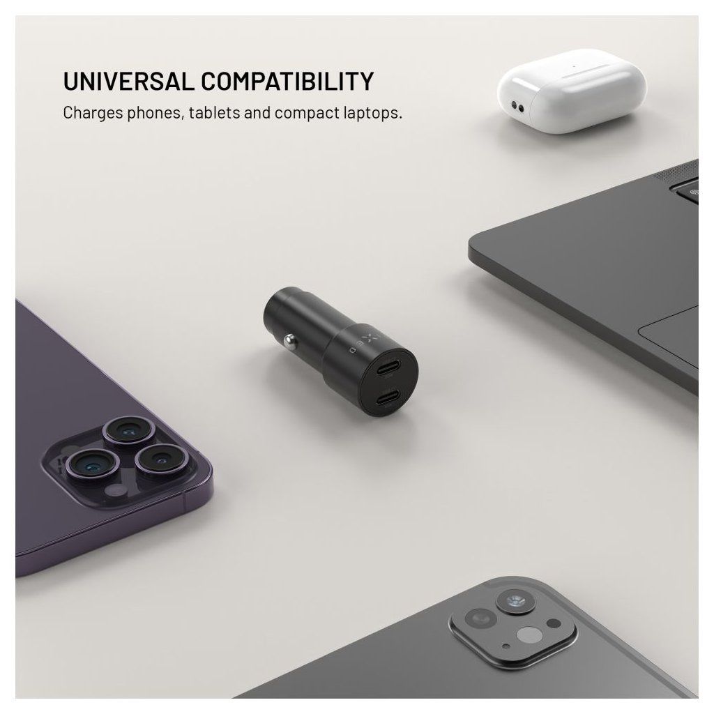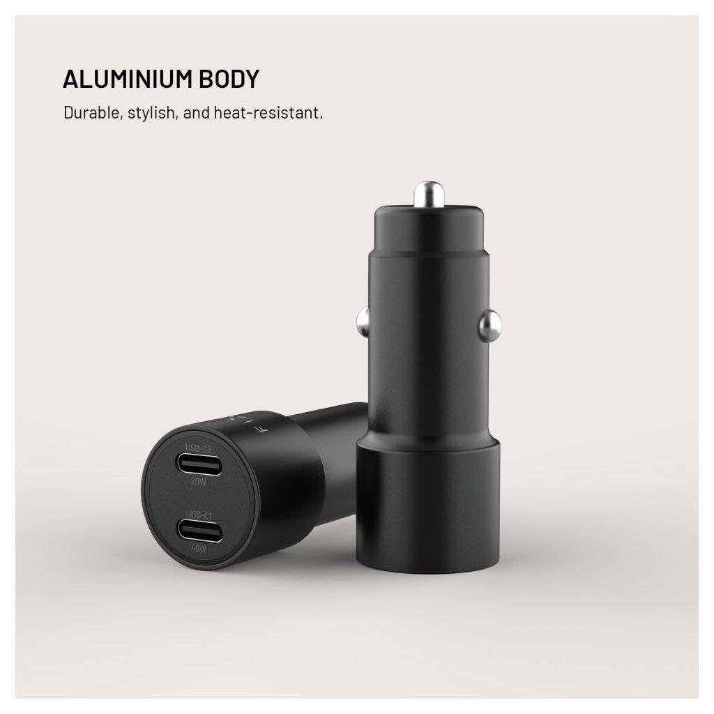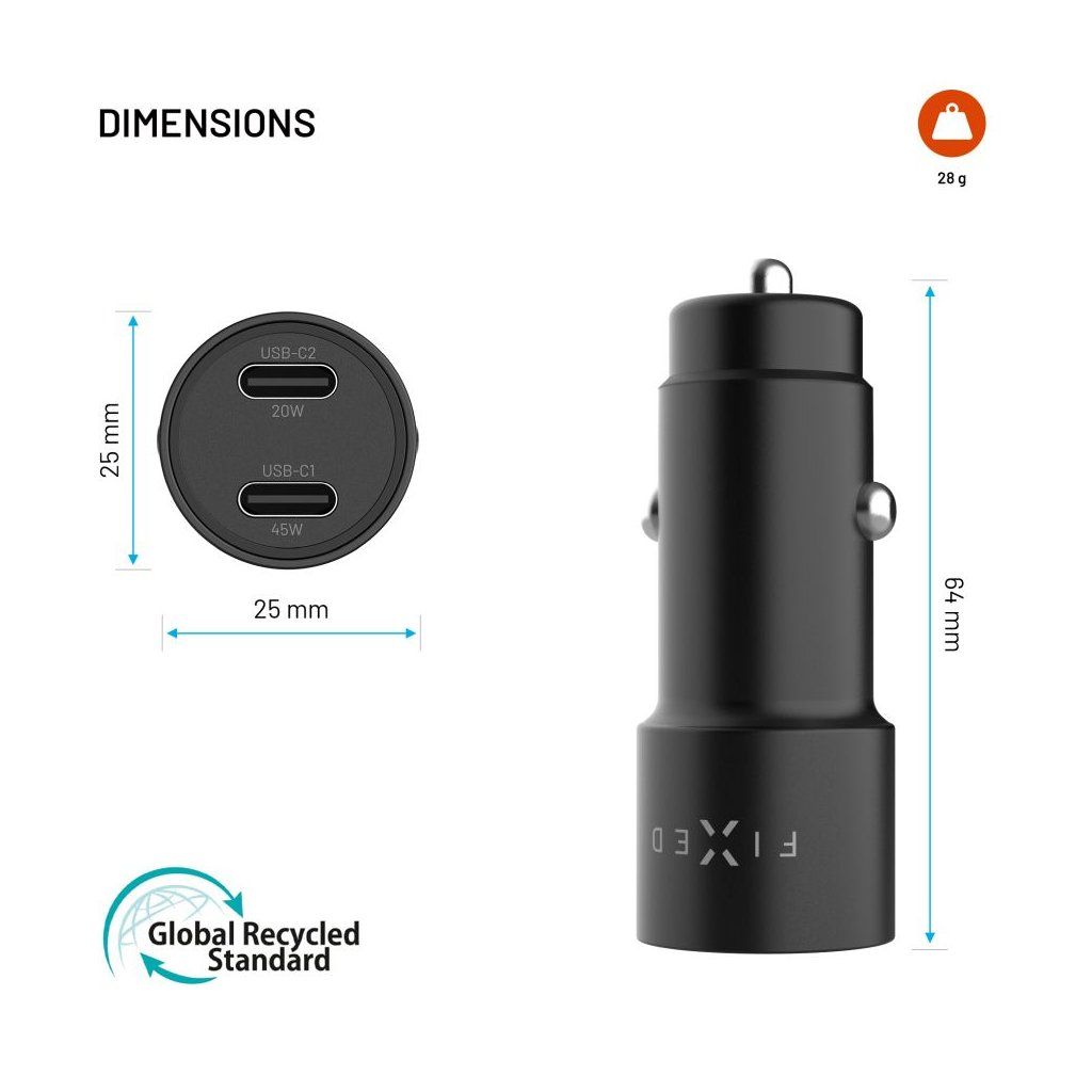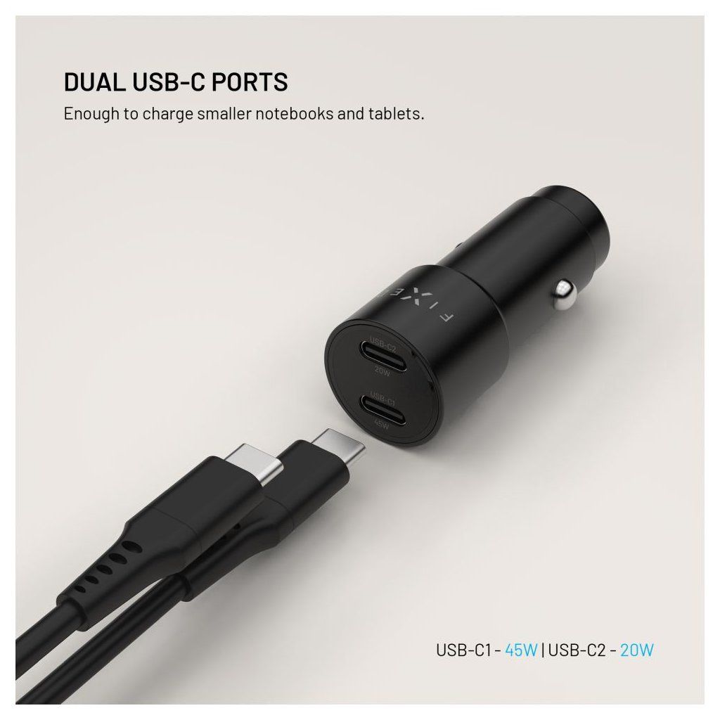 Autonabíječka FIXED přináší výkonné a bezpečné nabíjení až 65W pro všechna vaše zařízení během jízdy. Díky dvěma USB-C portům s výkony 45W a 20W zvládne současně dobíjet telefon, tablet nebo dokonce dodat dostatek energie pro nabíjení notebooku. Díky podpoře Power Delivery 3.0. je zajištěno rychlé dobíjení i během krátkých cest. Nabíječka je určena pro použití do zásuvky zapalovače osobních i nákladních vozidel nebo v karavanech. Kompaktní rozměry zajišťují, že je nabíječka nenápadná, nepřekáží a její odolné hliníkové tělo přirozeně zapadne do designu vozu. Ať už jedete do práce, na víkend nebo přes půl Evropy, s autonabíječkou FIXED vám energie nikdy nedojde.Vlastnosti: