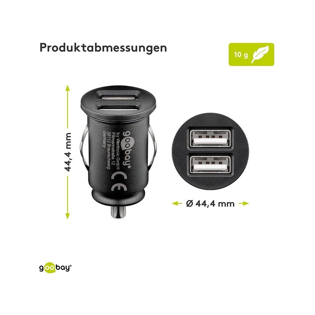 goobay Napájecí 12/24V autoadaptér na 2x USB 3,1A černý Nabíjecí adaptér na 2x USB port pro použití v autě. Umožní napájet a nabíjet USB zařízení s celkovým maximálním proudovým odběrem do 3100 mA - Pro rychlé nabíjení v zásuvce zapalovače cigaret - Nabíjí současně dvě USB zařízení velkým proudem do celkového proudu 3,1 A - Vstupní konektor: Autozapalovač - Výstupní konektory: 2x zásuvka USB (typ A) - Vstup: 12/24 (DC) V, 12 V max. 1400 mA. - Výstup: napětí 5 V (DC) 1x 3,1 A nebo 2x 1,55 A - Výstup, max. proud celkem: 3.1 A - Černá barva - Označení CE, WEEE Délka 44,4 mm Průměr 25,2 mm Hmotnost 13,1 gDoplňkové parametry