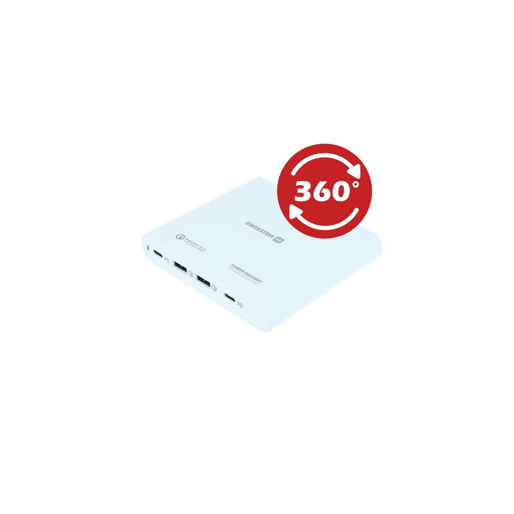 Síťový adaptér s výkonem 87W pro dobíjení Notebooků a MacBooků. Adaptér je vybavena výstupy 2XUSB-C s technologií rychlého nabíjení POWER DELIVERY pro zařízení s IOS a 2xUSB s rychlým nabíjením Qualcomm pro zařízení s OS Android .Baleno v blistru SWISSTEN.