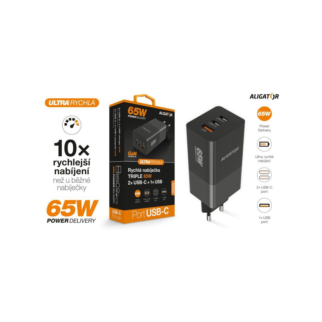 Rychlá GaN nabíječka ALIGATOR s technologií Power Delivery 65W představuje ideální řešení pro rychlé a efektivní nabíjení vašich mobilních zařízení. Díky pokročilé GaN technologii (gallium nitride) získáváte výjimečný výkon v kompaktních rozměrech, což z této nabíječky činí perfektního společníka pro domov i cestování.