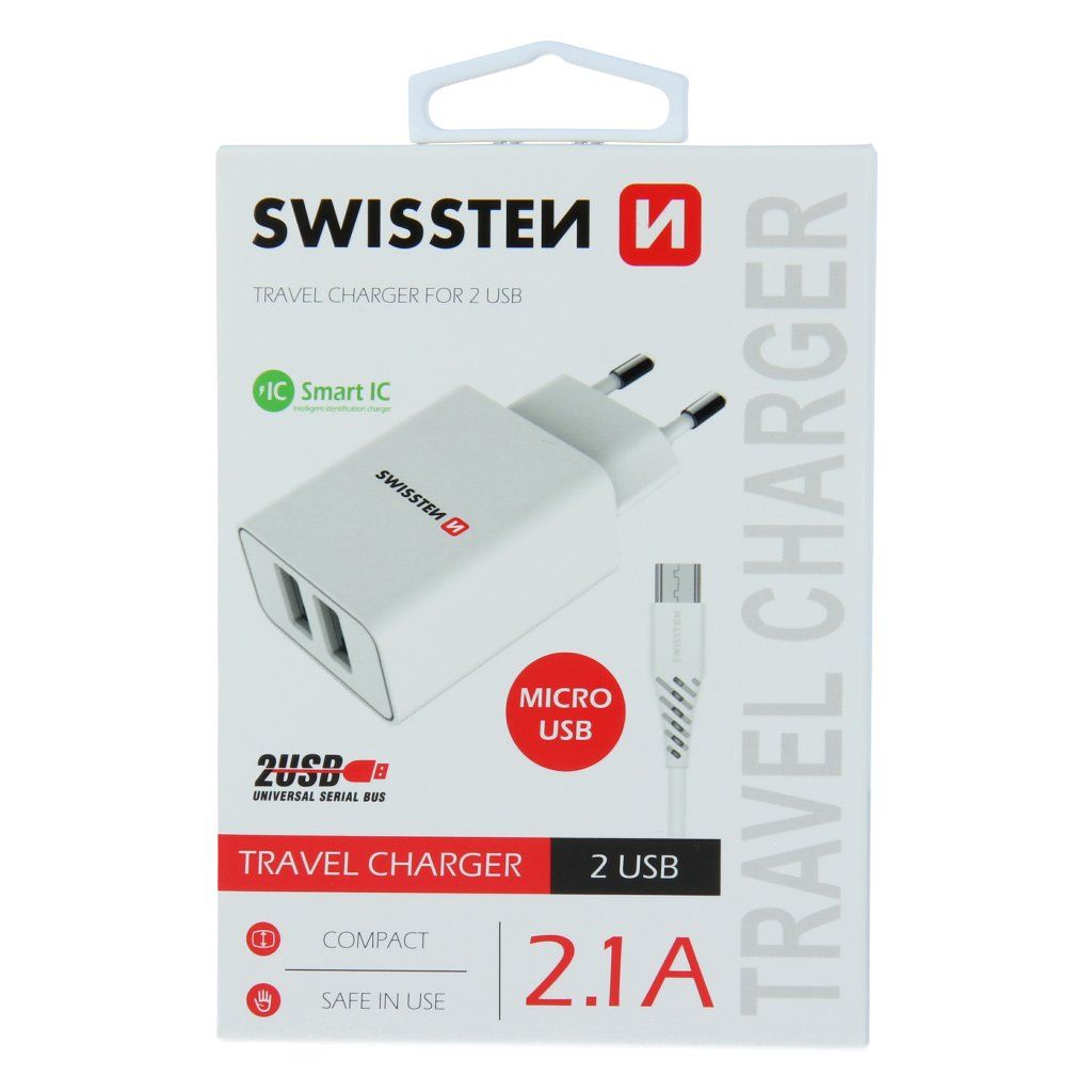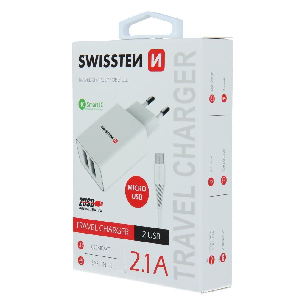 Kvalitní nabíječka s výstupním proudem 2,1A , technologií Smart IC a dvěma výstupy USB. V balení 1,2 m dlouhý Micro USB kabel. Baleno v blistru SWISSTEN.Smart IC