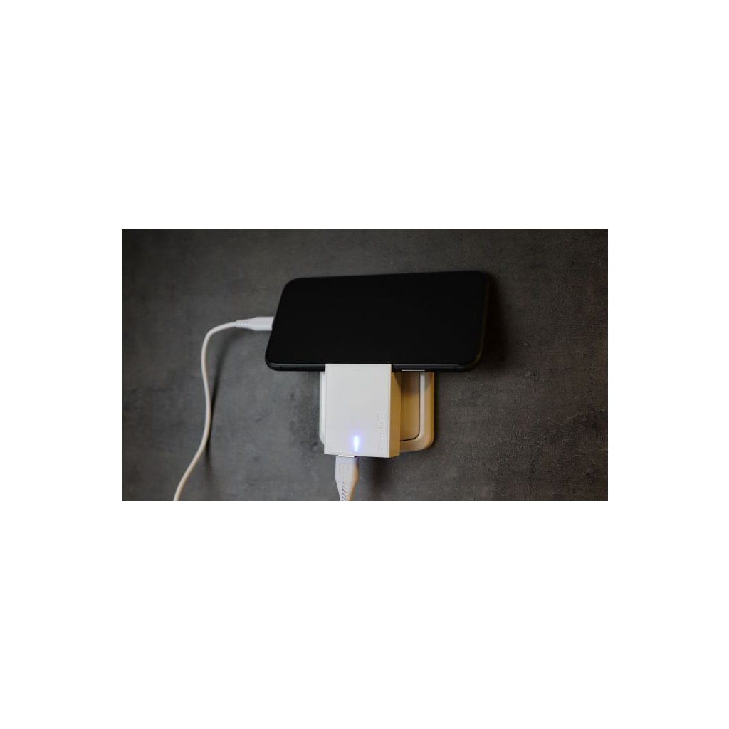 Tvar nabíječky, který navrhl český designér skrývá hned několik předností. Jednak díky slimové variantě a spodnímu umístění USB výstupům je vhodná i pro nabíjení ze zásuvek umístěných za nábytkem či spotřebiči. Další výraznou předností je drážka na vrchní hraně nabíječky, která slouží jako stojánek k položení smartphonu.
