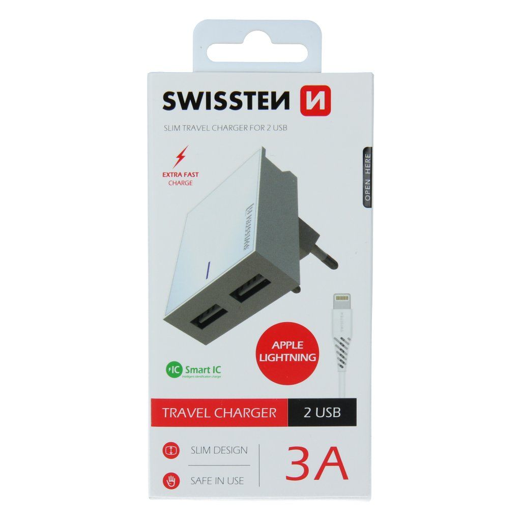 Jedinečná SLIM nabíječka s výstupním proudem 3A, technologií Smart IC, stojánkem pro umístění smartphonu, dvěma USB porty. Lze využít za nábytek, do zásuvky ve volném prostoru nebo kdekoliv jako držák smartphonu. V balení 1,2 m dlouhý kabel pro Apple. Baleno v blistru SWISSTENSmart IC