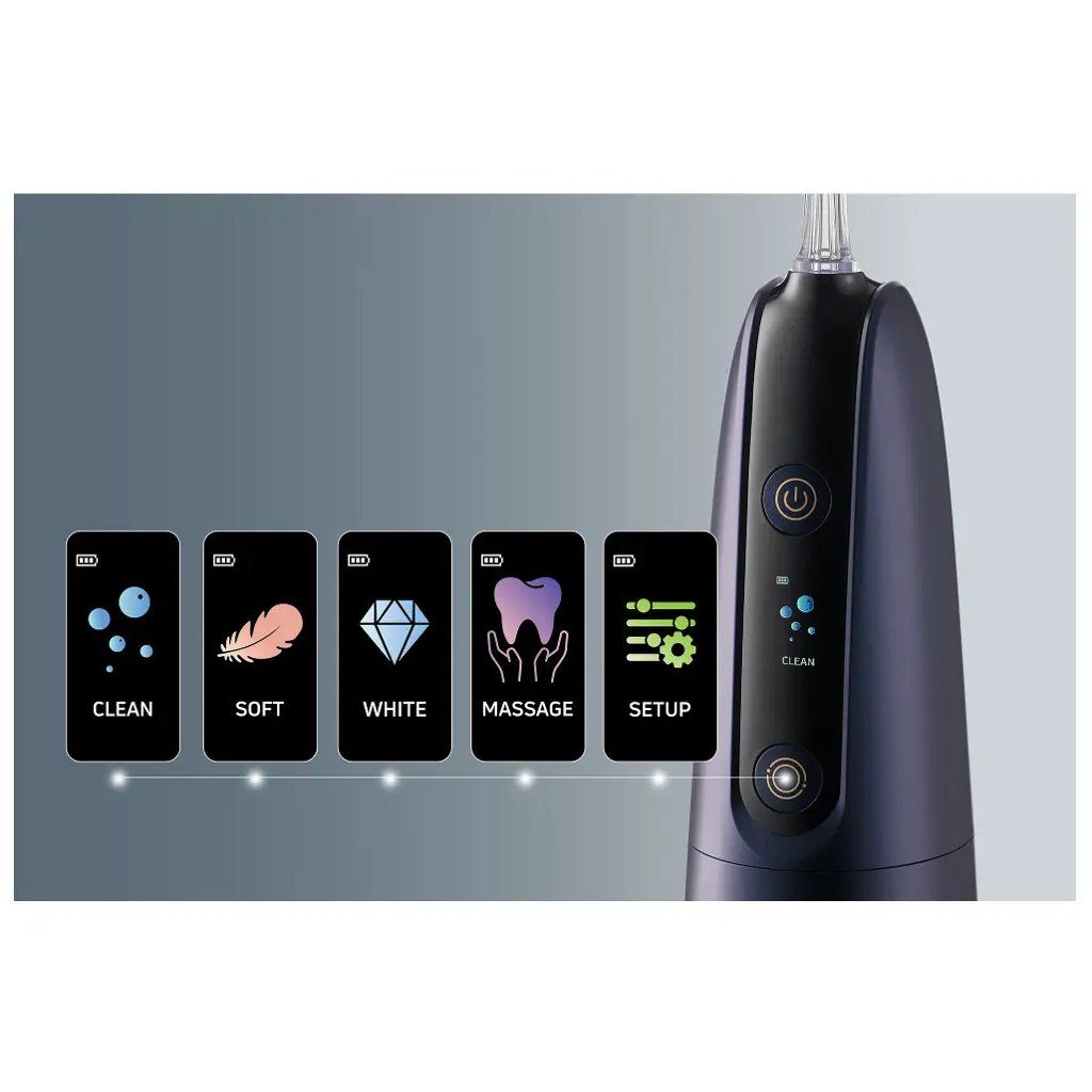 - 5 provozních režimů: Soft (jemné čištění pro citlivé zuby), Clean (každodenní použití), White (důkladné čištění), Massage (masáž dásní) a Setup (vlastní nastavení tlaku vody).