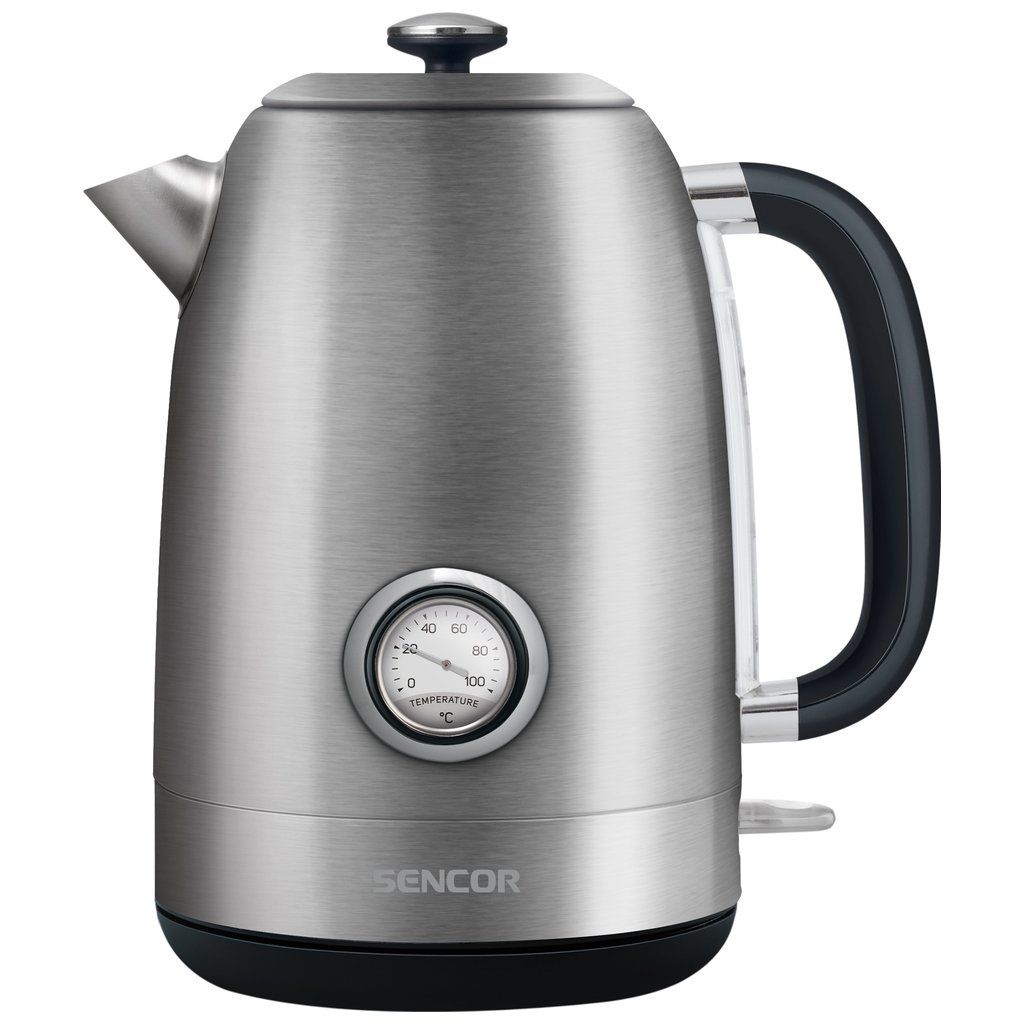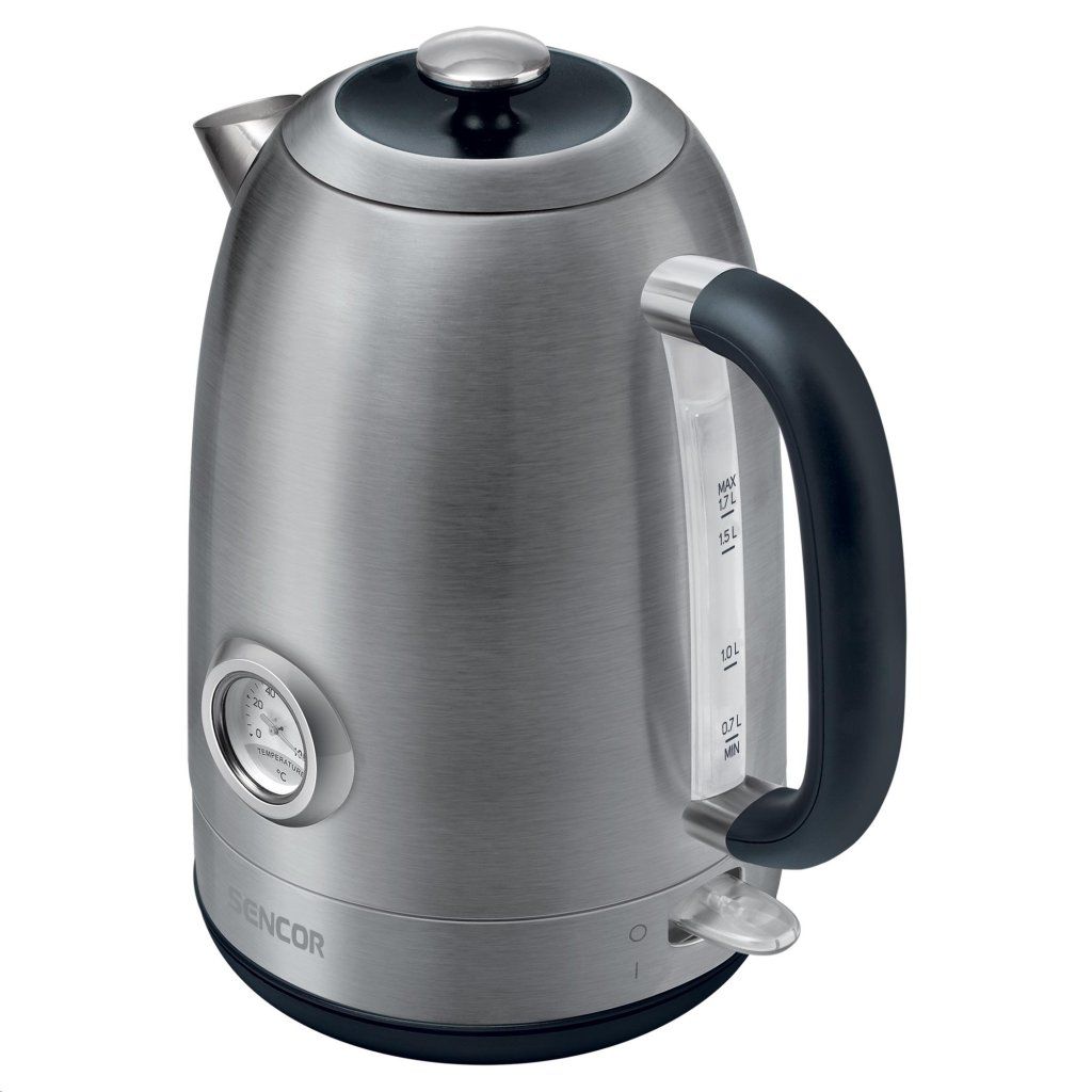 Nerezová rychlovarná konvice s ručičkovým teploměrem.