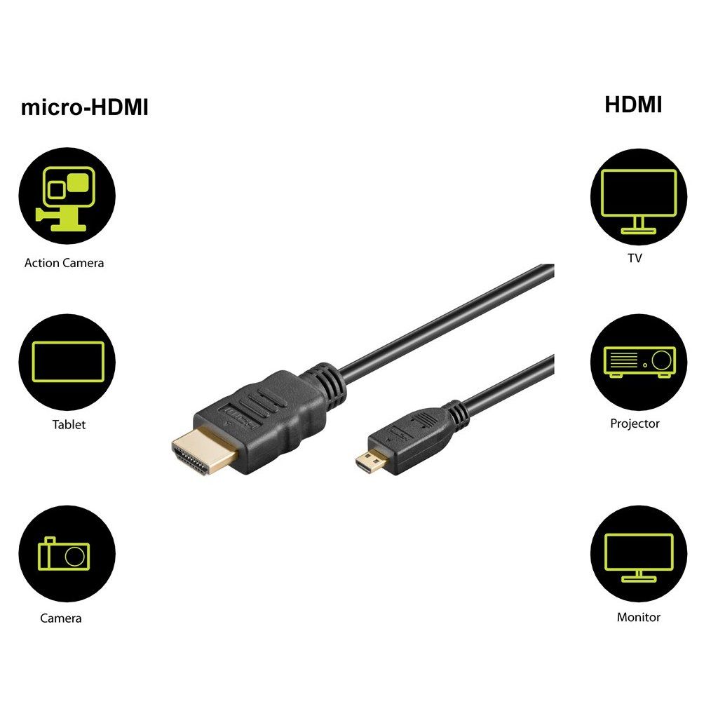 Kvalitní propojovací kabel pro spojení dvou audio/video zařízení přes moderní HDMI rozhraní. Používá se také k propojení moderních telefonů a fotoaparátů do televize. Kabel je stíněný, dokáže přenášet digitální zvuk i obraz a podporuje digitání ochranu obsahu HDCP. - Pozlacené konektory: HDMI typ A (19pinů) male <=> HDMI micro typ D (19pinů) male - Maximální rozlišení: 4K@25Hz (3840 × 2160) nebo 1080p FULL HD (1920 x 1080) nebo nižší podporované formáty 1080i/720p/720 - Barevná hloubka: 24-bit (16.7 million barev). - 19-wire cable, double shielded, AWG34 - Kabel: UL20276 - HDMI Highspeed with Ethernet - Barva černá - Délka kabelu: 3mDoplňkové parametry
