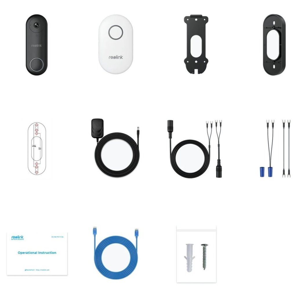 Obsah balení: zvonek s kamerou, interiérový zvonek, montážní deska, montážní klín, šablona montážních otvorů, napájecí adaptér (1,5 m), prodlužovací kabel (4,5 m a 0,1 m), propojovací kabely, síťový kabel (1 m) a vruty.