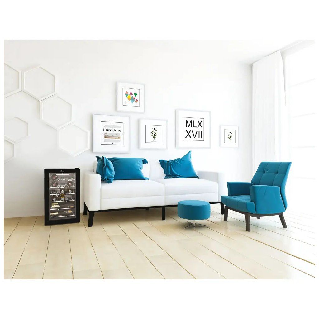 Elegantní černý design s dvojitým sklem v dvířkách dokonale doplní jakýkoliv interiér, zatímco chromované police a LED osvětlení dodávají celému zařízení prémiový vzhled. Díky tichému chodu s hlučností pouhých 39 dB můžete vinotéku umístit kamkoliv - do kuchyně, obývacího pokoje nebo domácího baru.