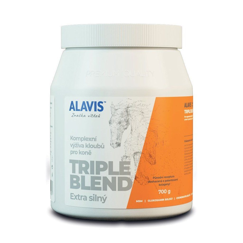 Přípravek Triple Blend Extra Silný účinně napomáhá regeneraci pohybového aparátu a vyživuje i chrání kloubní chrupavky i tkáně. Zpevňuje vazy a šlachy a působí regeneračně na samotné svaly. Přípravek obsahuje kombinaci chondroprotektivních látek, methylsulfonylmethanu (MSM) a značkových kolagenů Collyss a Cartidyss. Zvířeti se tak dostává těch nejužitečnějších složek pro jeho klouby.