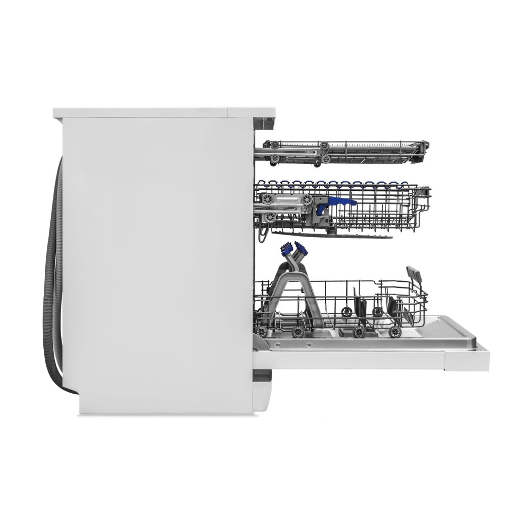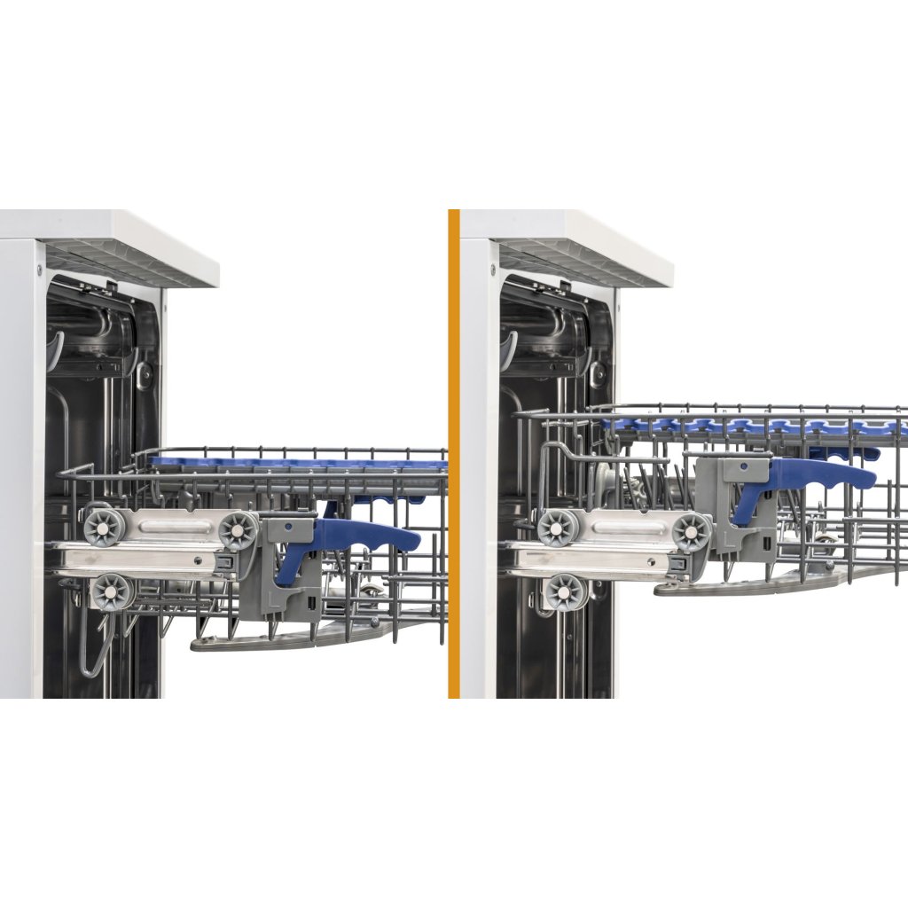 Myčka je vybavena třemi úrovněmi pro vkládání nádobí, včetně speciální příborové zásuvky, která zajišťuje optimální umytí každého kousku příborů. Výškově nastavitelný horní koš umožňuje flexibilní uspořádání a mytí i objemnějšího nádobí. Inteligentní automatické otevírání dveří po skončení programu zlepšuje proces sušení a zabraňuje vzniku kondenzátu.