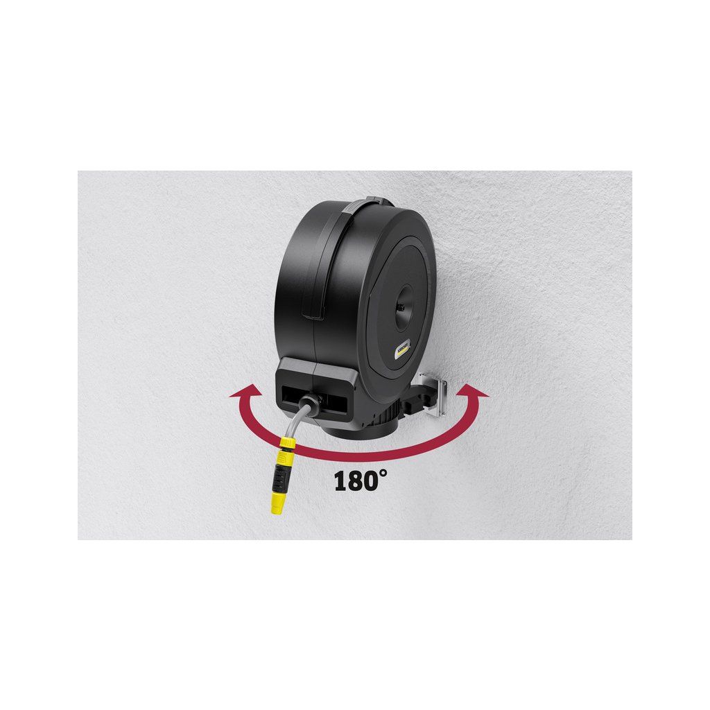 - Otočný nástěnný držák: Box lze na držáku otáčet o více než 180°, což umožňuje snadný přístup do různých částí zahrady bez zalomení hadice.