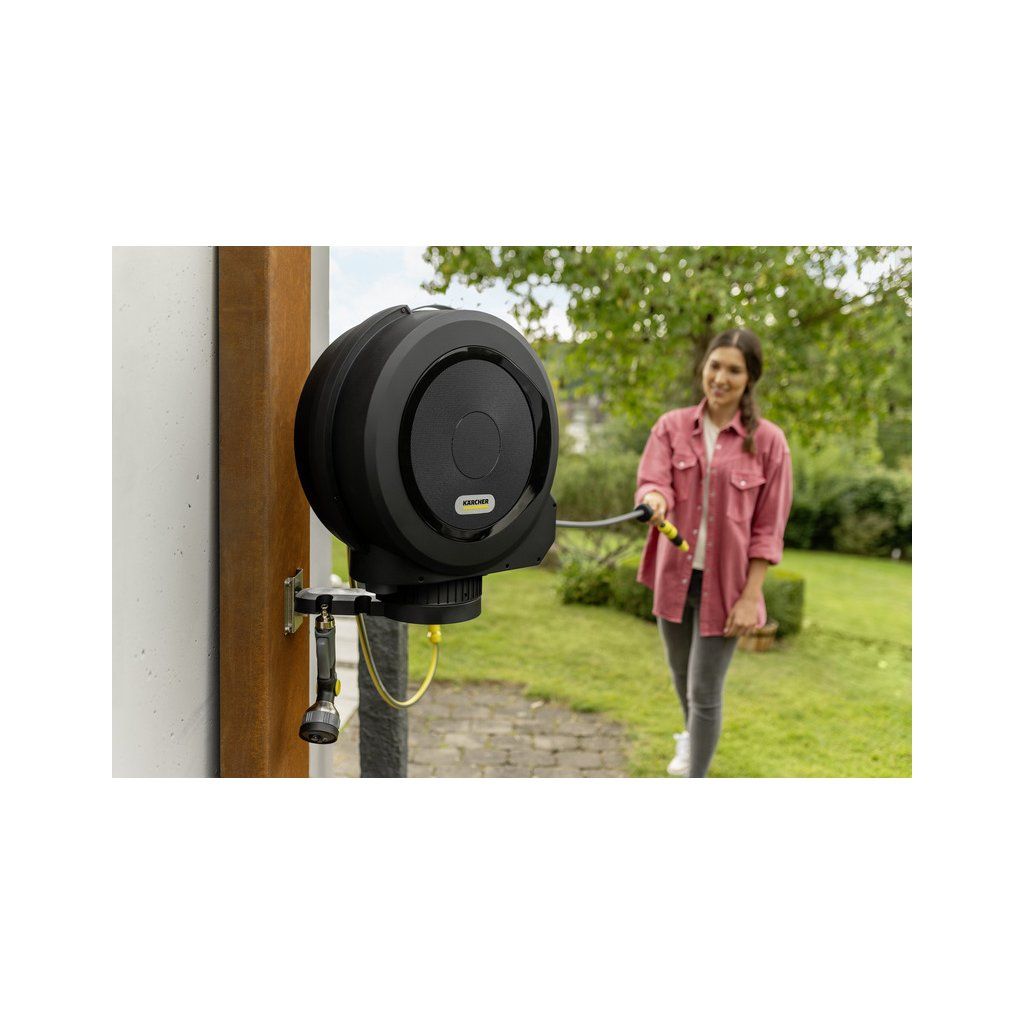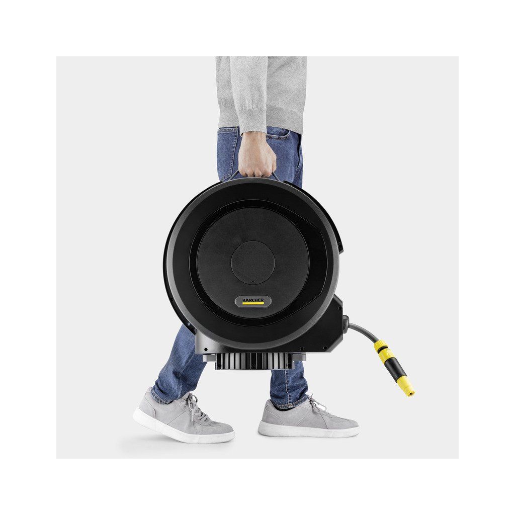 - Automatické navíjení: Hadice se při mírném zatažení za konec plně a kontrolovaně navine pomocí integrované brzdy, což zabraňuje vzniku uzlů a poškození.