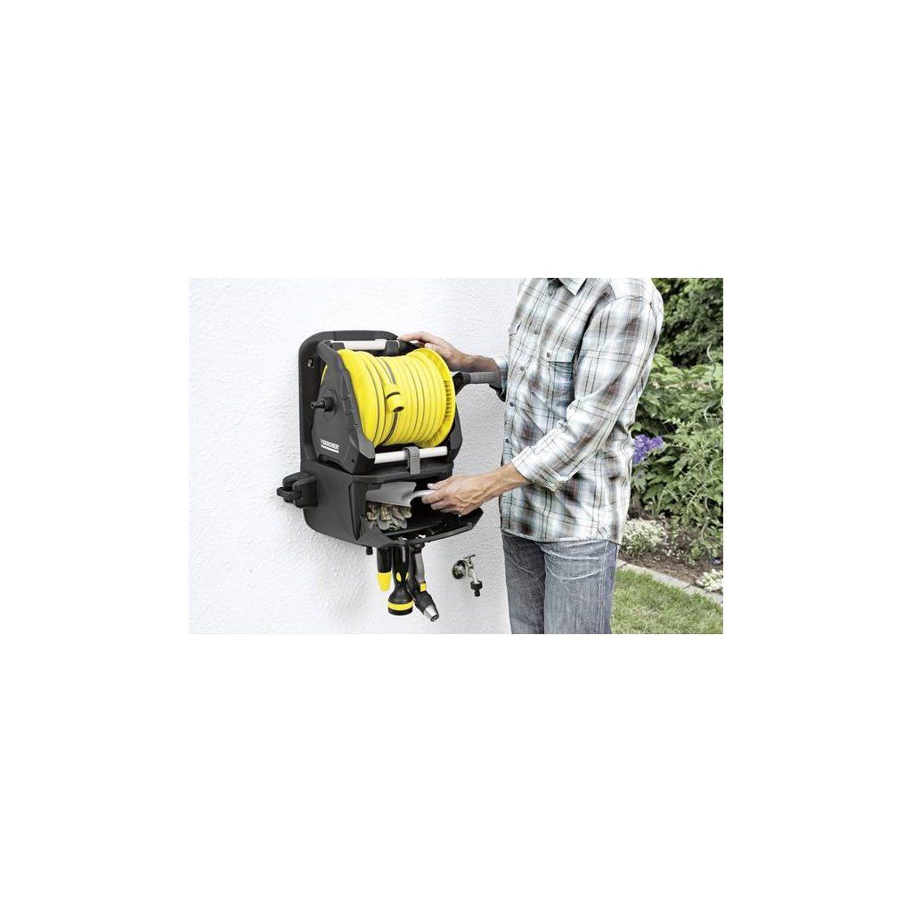 Kompaktní zavlažovací stanice! Hadicový nosič Kärcher Premium HR 7.300 pro mobilní nebo stacionární používání je perfektní pro zavlažování malých až středně velkých ploch a zahrad. Díky množství úložného prostoru je konečně vše uloženo na jednom místě. Vybavení: odnímatelný hadicový buben (2 v 1), úložný prostor pro postřikovače a skrápěče, prostorný úložný box pro zahradní rukavice, nůžky, lopatky atd. Vč. držáku na stěnu a 2 hadicových spojek a dodatečné fixace pro zalévací tyče. Vhodné pro všechny běžné zahradní hadice (kapacita: 30 m 1/2"-hadice nebo 20 m 5/8"-hadice nebo 12 m 3/4"-hadice). Zavlažování s Kärcherem znamená chytré zavlažování.