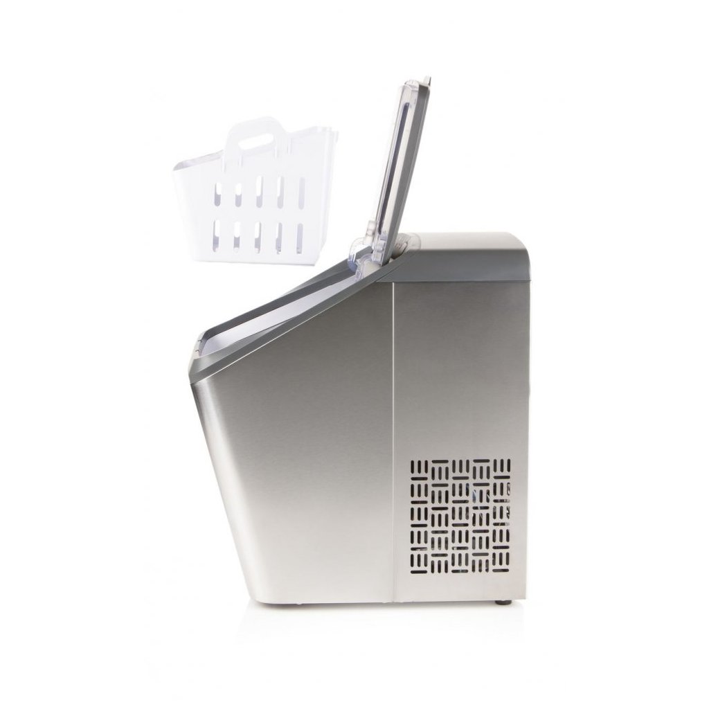 Výkoný výrobník ledu v nerezovém provedení vybavený vlastním kompresorem umožňujícím připravit až 15 kg ledových kostek za 24 hodin. Výrobník dokáže každých 8 minut vytvořit 9 kostek ledu u kterých si můžete zvolit ze dvou velikostí. Přístroj za vás hlídá množství vody i množství vytvořených ledových kostek a vždy vás upozorní na prázdný zásobník vody, nebo plný zásobník ledu a automaticky dočasně přeruší provoz. Díky průhlednému víku máte nad výrobou ledových kostek plnou kontrolu, aniž byste museli přístroj otvírat. Obsluha přístroje je velice snadná a pro usnadnění údržby přístroj disponuje také funkcí samočištění.