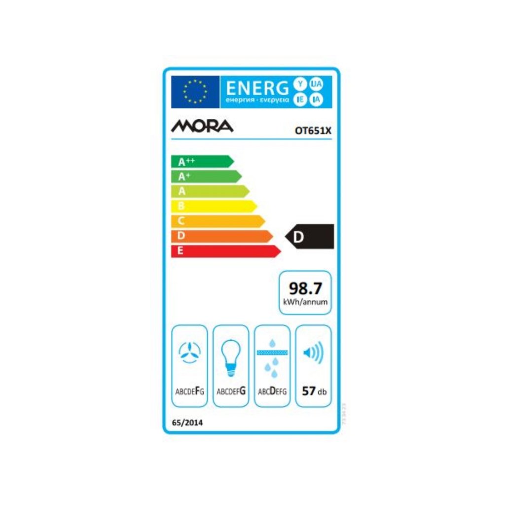 Vestavný odsavač par v energetické třídě D a nerezovém provedení. Mora OT 651 X disponuje 3 rychlostmi výkonu, tlačítkovým ovládáním, LED osvětlením a hliníkovými omyvatelnými filtry proti mastnotám. Odsavač umožňuje práci v odtahovém i recirkulačním režimu.Doplňkové parametry