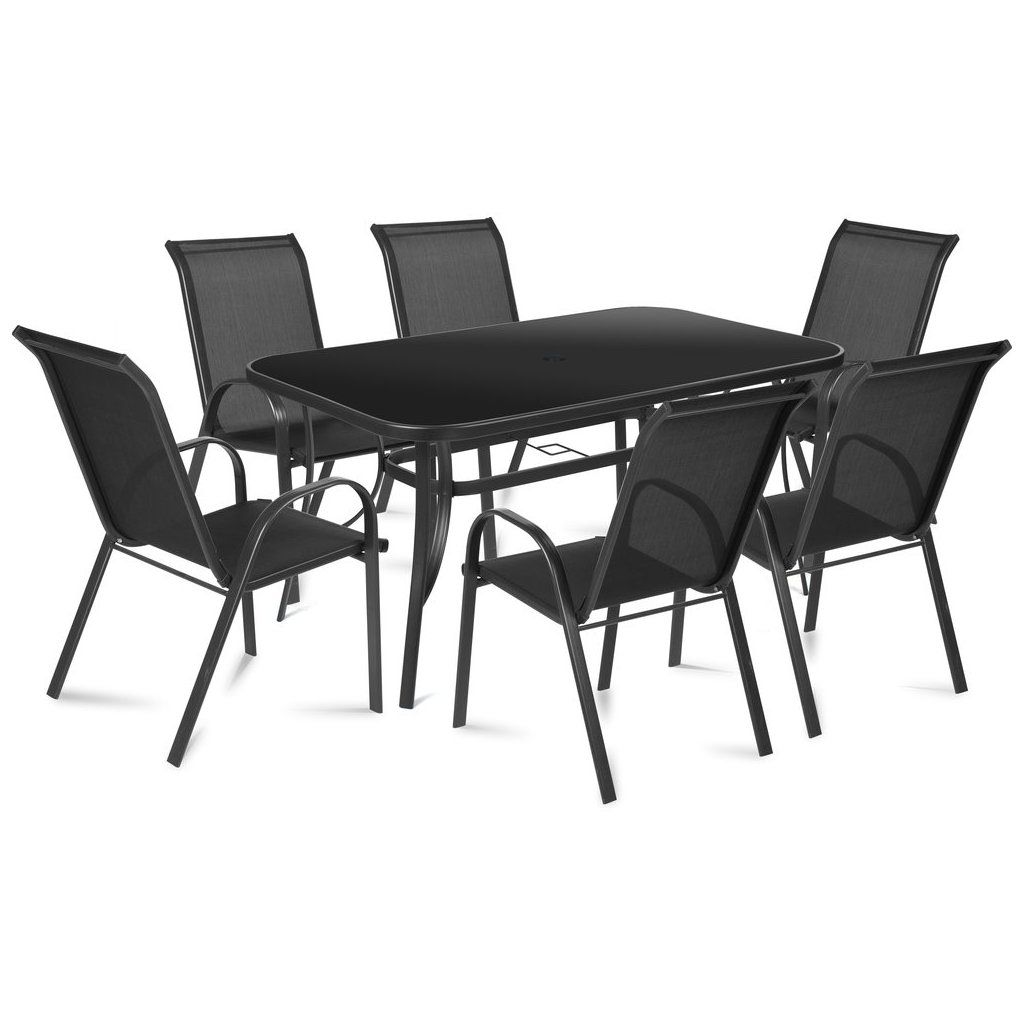 Kvalitní a cenově dostupná sestava zahradního nábytku. Set je složen ze stolu s černou deskou o rozměru 150 x 93x 71 cm a šesti křesel 55 x 73 x 91 cm. Deska stolu je vyrobena z tvrzeného skla a v jejím středu je otvor pro slunečník. Výplň křesel z pružné syntetické textilie zvyšuje pohodlí. Tento nábytek je zcela bezúdržbový a je ideální volbou pro venkovní použití.Sestava kovového nábytku složená ze 6 křesel a stolu