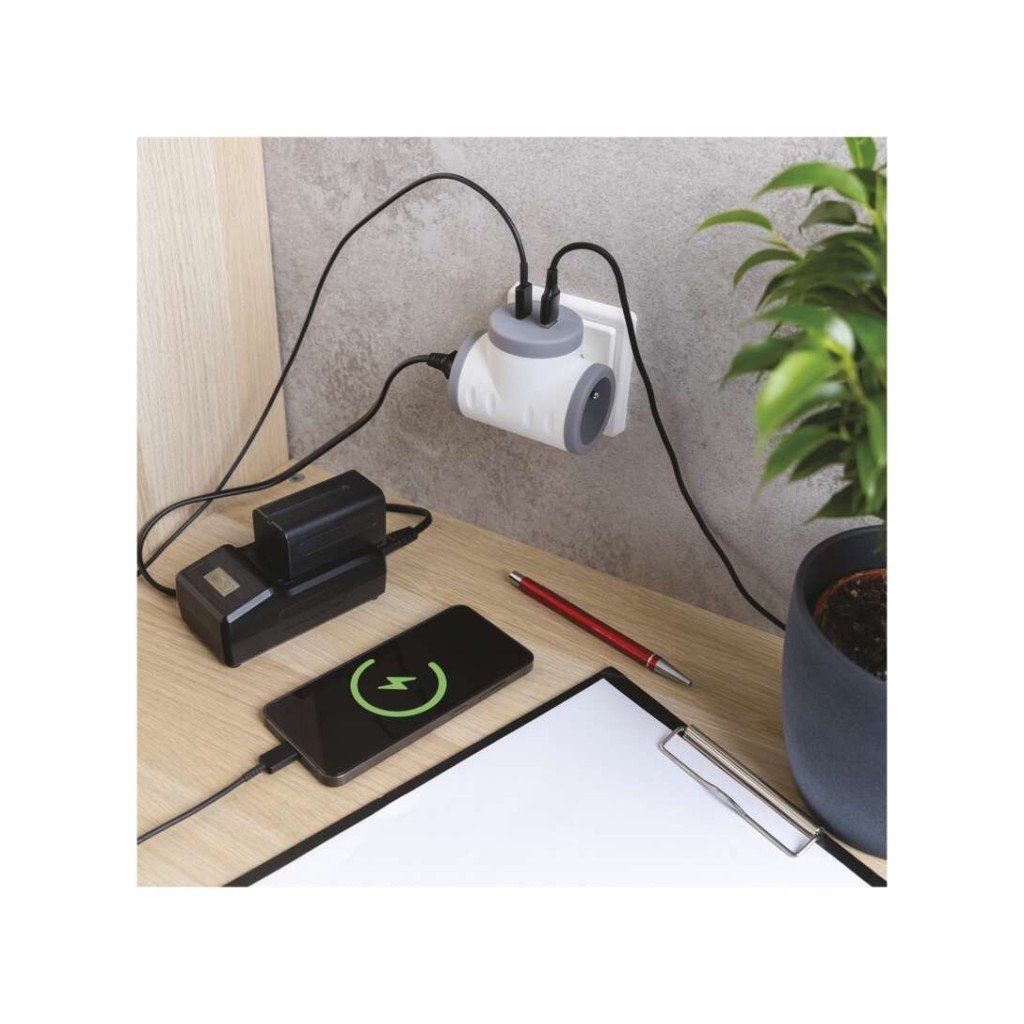 barva: bílá/šedá|dálkový ovladač: –|dětské clonky: ano|dosah signálu: –|easy learning: ne|krytí: IP20|materiál: plast|max. zátěž: 3 680 W|možnost ovládání: ne|napětí/proud: 250 V~/16 A max.|počet pólů: –|počet zásuvek: 2× 2P + PE|pozice ochranného kontaktu: –|přenosoná frekvence: –|prodejní obal: 1 ks, závěs|produkt: rozbočovací zásuvka 2× + 1× USB-A (QC 20 W) + 1× USB-C (PD 20 W)|typ: FRENCH|venkovní použití: ne|vypínač: neDoplňkové parametry
