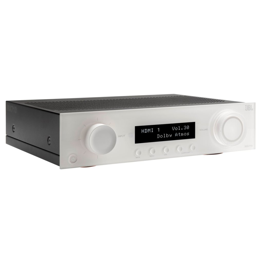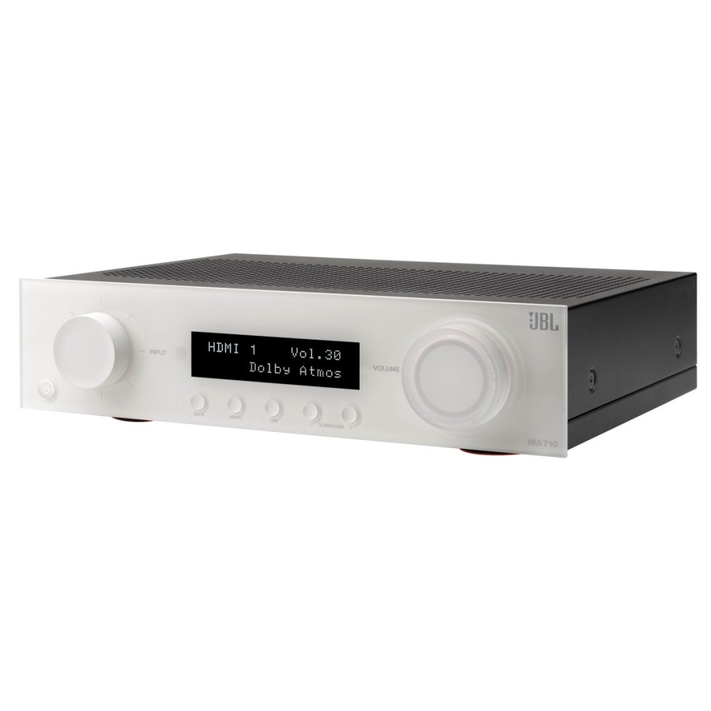 JBL MA710 představuje špičkový AV zesilovač 7.2 kanálů z nové řady JBL, který kombinuje prvotřídní zvukovou kvalitu, inteligentní funkce a jednoduchou obsluhu PLUG & PLAY v moderním designovém provedení. Tento model vyniká podporou 8K videa, technologií Dolby ATMOS a nabízí širokou konektivitu přes Wi-Fi i Bluetooth. Dominantním prvkem je elegantní skleněný design čelního panelu (dostupný v černé nebo bílé variantě), který nezanechává otisky prstů, s přehledným displejem a minimalistickým ovládáním.